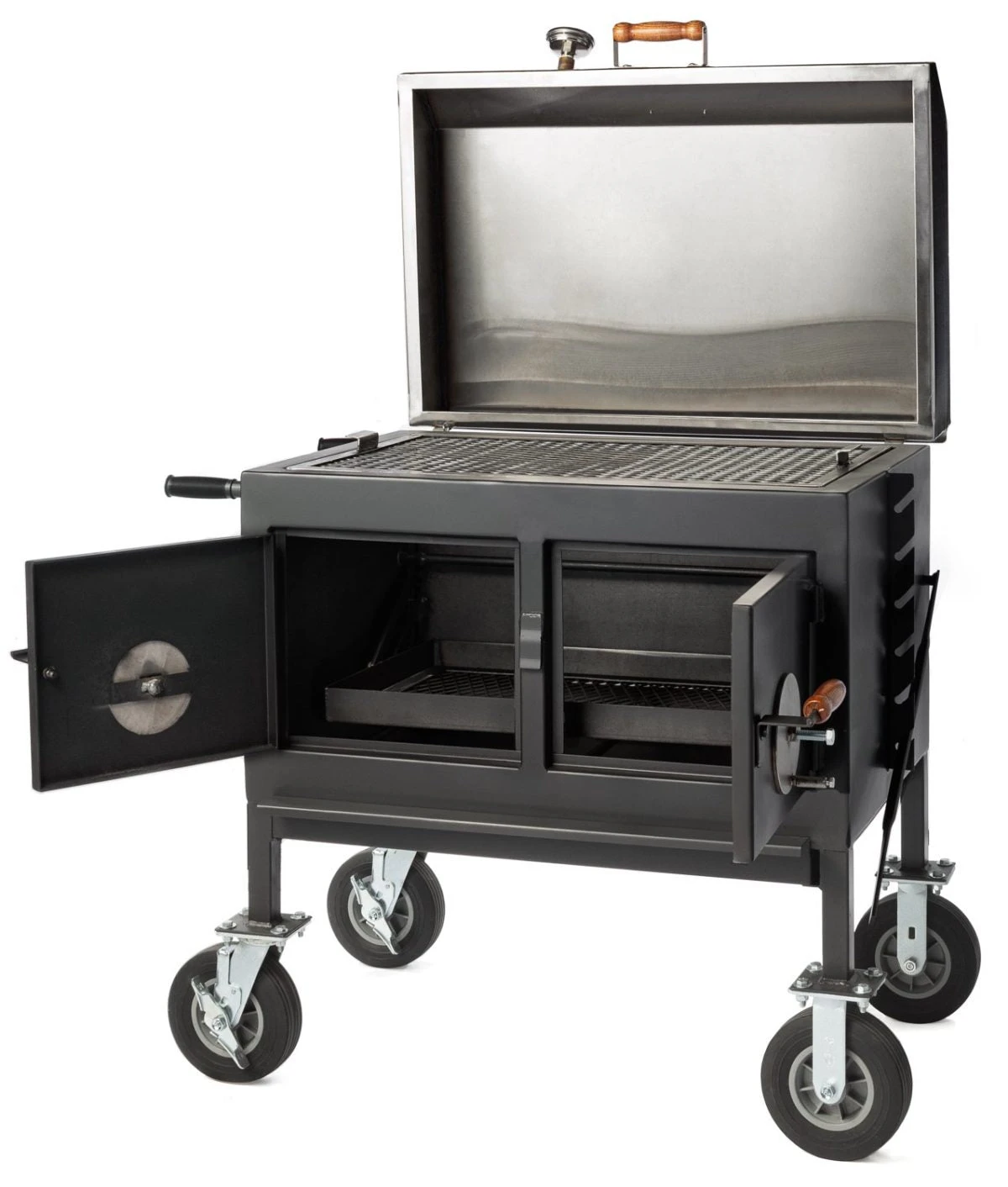 The carbon steel cooking chamber and fire chamber is made of 12 gauge carbon steel.