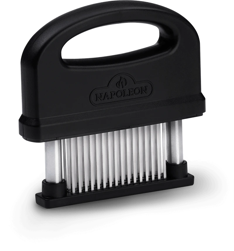 Increase flavor and reduce cooking time by using Napoleon’s 48 Blade Meat Tenderizer. Make notoriously tough cuts of meat into succulent feasts with minimal time and effort. Marinades penetrate deeper into meat, and irregular cuts of meat cook more evenly. The sturdy, ergonomic handle makes it easy to efficiently push the sharp blades into meat. Wash on the top rack of the dishwasher for easy clean up. Storage is completely safe with the locking blade cover, so there’s no worry of unintentionally tenderizing yourself.